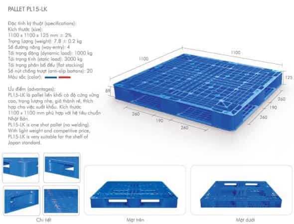Pallet PL15LK là loại pallet liền khối có độ cứng cao, trọng lượng nhẹ, giá thành rẻ, thích hợp cho việc xuất nhập khẩu đóng trong container. Kích thước 1100x1100mm phù hợp với hệ tiêu chuẩn Nhật Bản
