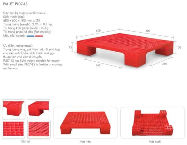 Pallet nhựa mới PL07-LS 600x600x100mm có trọng lượng nhẹ, giá thành rẻ, rất phù hợp cho việc xuất khẩu, kích thước nhỏ gọn thuận tiện cho việc di chuyển