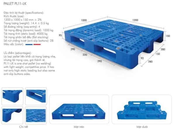 Pallet PL11LK là loại pallet có tự trọng nhẹ nhưng lại có thể chịu được tải trọng cao từ 1000kg đến 4000kg, bề mặt trên đan lưới, bề mặt dưới đan ô cửa sổ có thể sử dụng được cho các loại xe nâng 2 càng